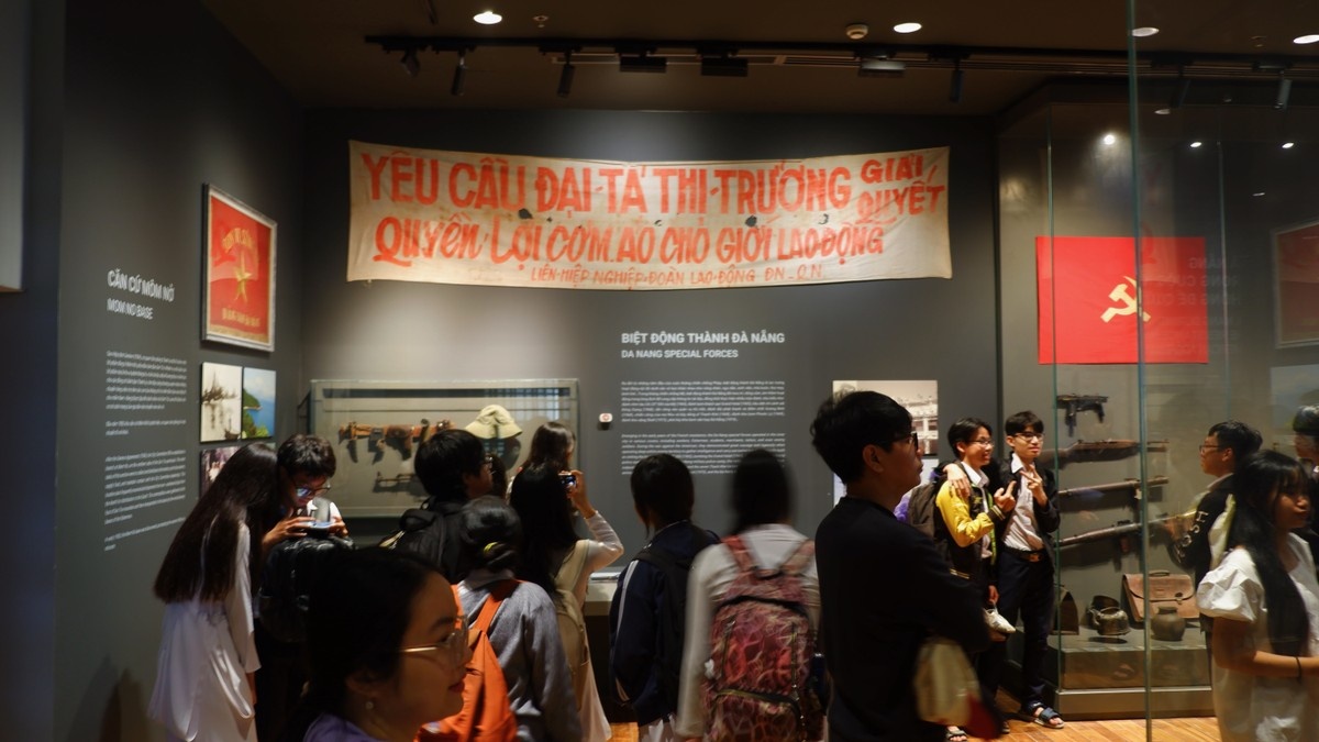 Bên trong bảo tàng là cảnh hàng nghìn người dân tham quan, tìm hiểu, khám phá lịch sử Đà Nẵng qua các thời kỳ. Du khách quá tải, lo ngại phát sinh các vấn đề nên bảo tàng phải đóng cổng chính, điều tiết khách.