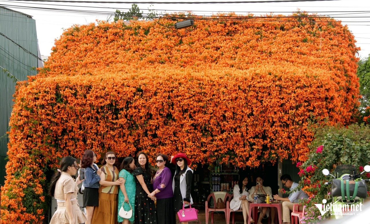 Căn nhà là tiệm tạp hóa của gia đình ông Hữu Thắng (64 tuổi, xã Gia Hiệp). Những ngày này, căn nhà được phủ kín bởi hàng nghìn chùm hoa xác pháo màu cam đang nở rộ.