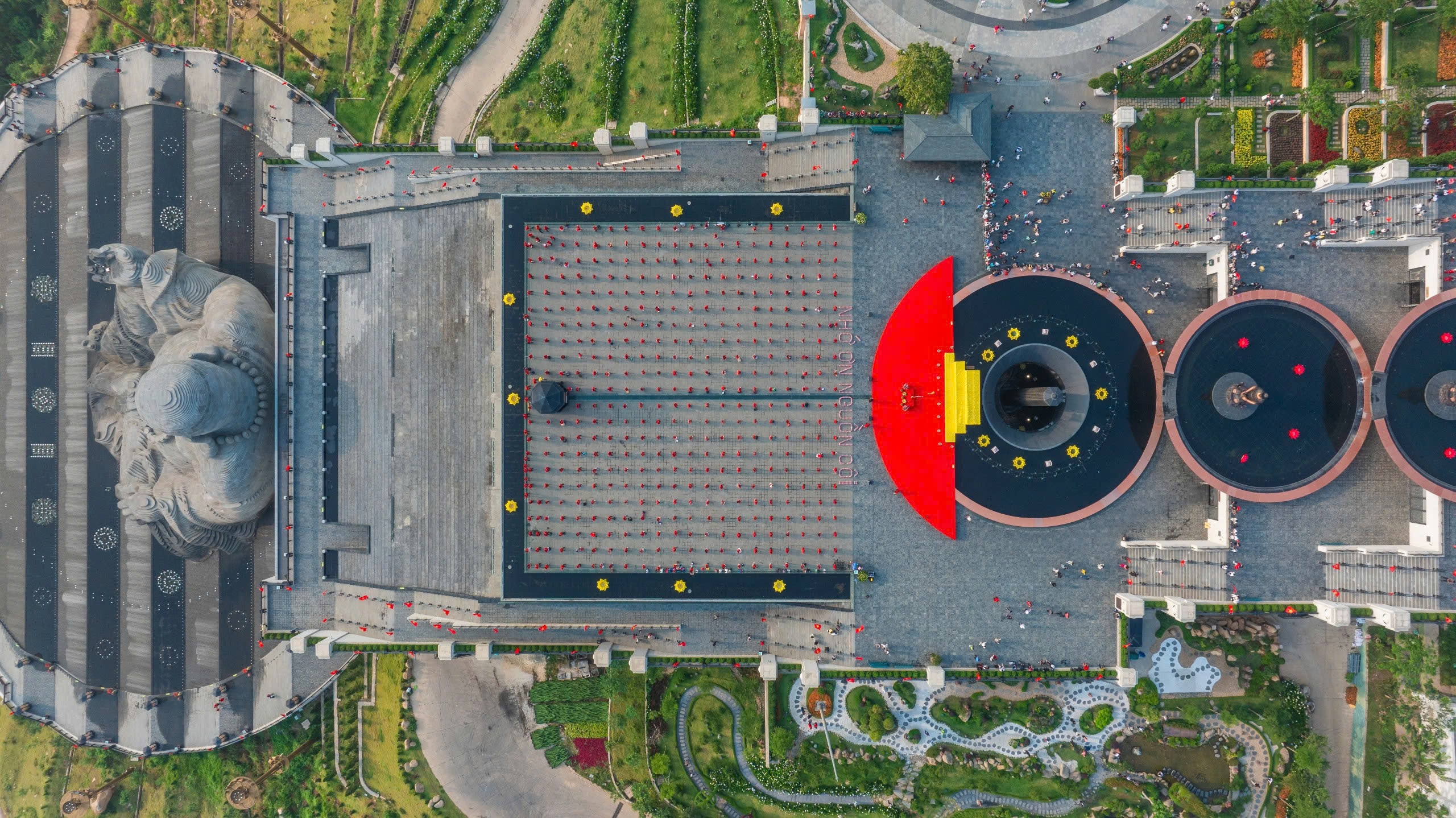 Hình ảnh người tham gia trong trang phục áo đỏ sao vàng cùng tụ hội dưới chân tượng Phật Bà Tây Bổ Đà Sơn, đồng lòng hướng mắt về lá cờ Tổ quốc đầy ấn tượng.