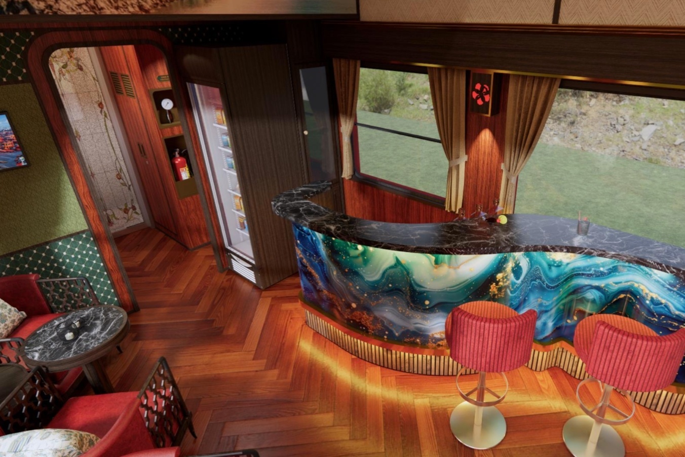 Phần toa xe được lắp sàn gỗ tự nhiên, hệ thống Wi-Fi và quầy bar phục vụ đồ uống và nhiều hoạt động biểu diễn âm nhạc.