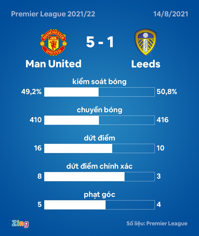 Man Utd khởi đầu mùa giải ấn tượng với chiến thắng 5-1 trước Leeds. Bruno tỏa sáng với 3 bàn thắng, trong khi Pogba có đến 4 đường kiến tạo.