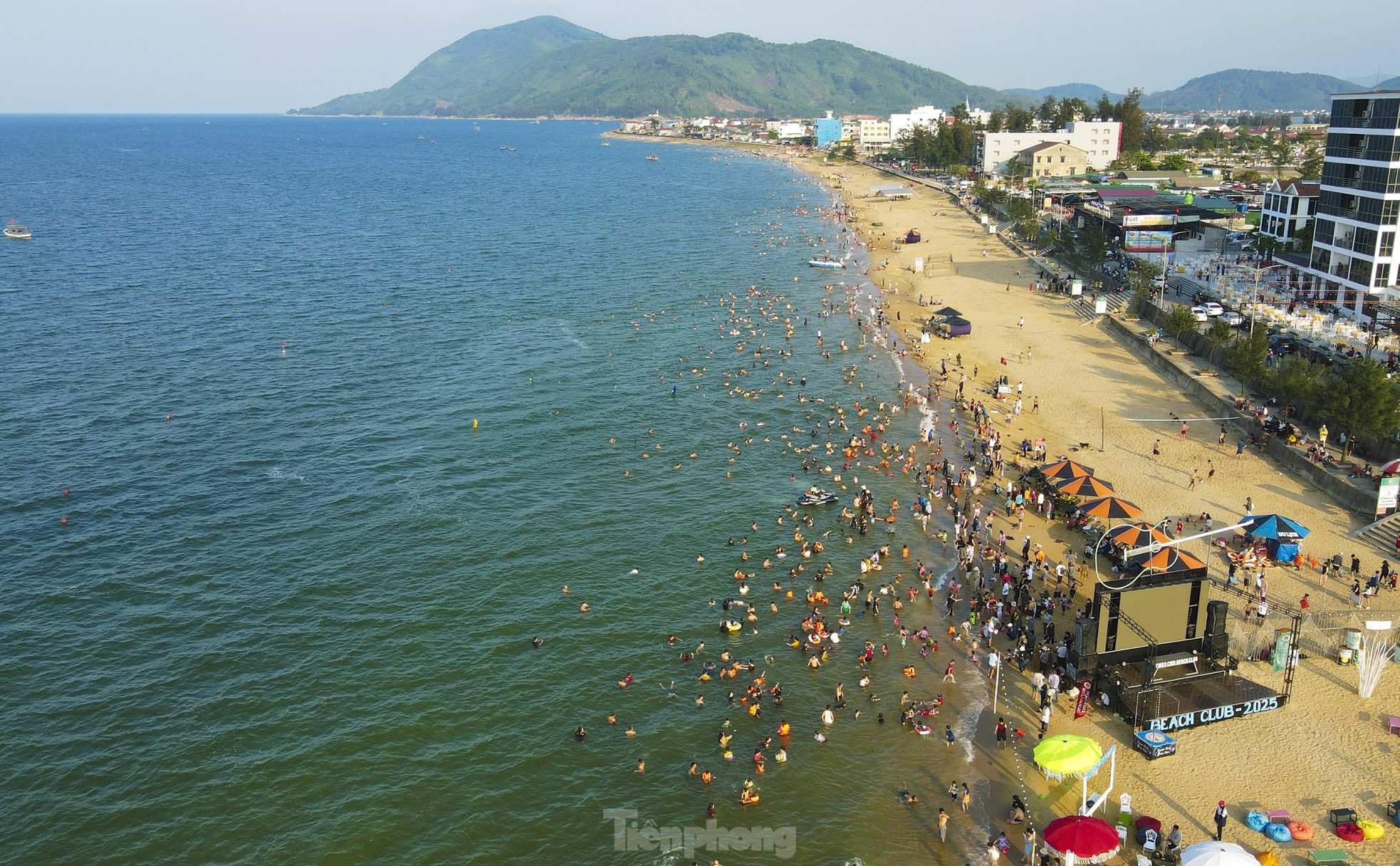 Khoảng 16h, khi nắng nóng dần dịu bớt, hàng nghìn người phủ kín bãi biển Thiên Cầm. Trên bờ biển dài hơn 3 km với bãi cát phẳng, làn nước trong xanh, sạch sẽ, du khách thỏa thích hòa mình với làn nước mát lạnh.