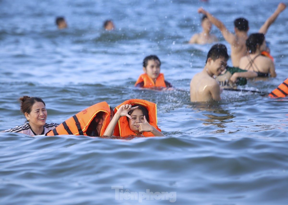 Với nền nhiệt dao động 33-35 độ C, rất đông người dân đi du lịch đều lựa chọn các bãi tắm để “giải nhiệt”. Các em nhỏ khi tắm biển đều có sự giám sát của người lớn.