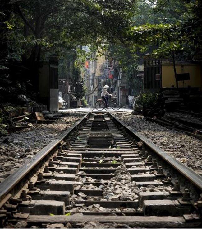 Một người đi xe đạp băng qua đường sắt ở Hà Nội. Ảnh: James Wendlinger